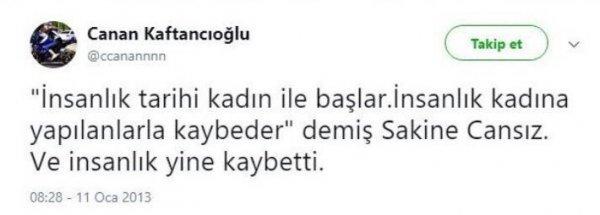 Kaftancıoğlu, geçmişte PKK'lı terörist Sakine Cansız için attığı tweet'te, "İnsanlık tarihi kadın ile başlar. İnsanlık kadına yapılanlarla kaybeder demiş Sakine Cansız. Ve insanlık yine kaybetti." ifadelerini kullandı. (İrade & Büyük Sivas)