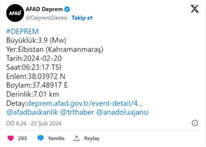 Merkez üssü Kahramanmaraş'ın Elbistan ilçesi olan 3.9 büyüklüğünde bir deprem oldu. Afet ve Acil Durum Yönetimi Başkanlığı (AFAD) tarafından yapılan açıklamaya göre, bugün saat 06.23'te merkez üssü Kahramanmaraş'ın Elbistan ilçesi olan bir deprem meydana geldi. Depremin büyülüğü 3.9 olarak duyuruldu. Depremin derinliğinin 7 kilometre olduğu kaydedildi.