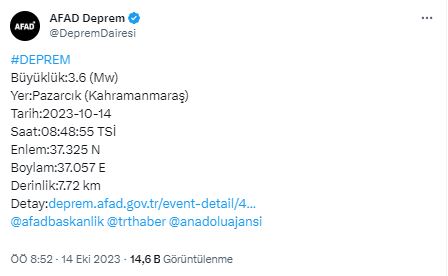 Afet ve Acil Durum Yönetimi Başkanlığının (AFAD) verdiği bilgiye göre, Kahramanmaraş Pazarcık ilçesinde 3,6 büyüklüğünde deprem meydana geldi. Saat 08.48’de meydana gelen depremin derinliği 7,48 km olarak ölçüldü. (İHA)