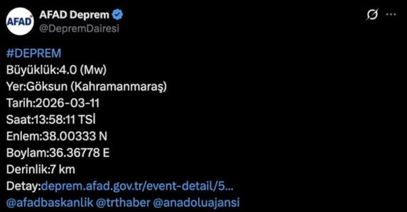 Kahramanmaraş’ta 4.0 Büyüklüğünde Deprem.. Afet ve Acil Durum Yönetimi Başkanlığı (AFAD) verilerine göre Kahramanmaraş’ın Göksun ilçesinde 4.0 büyüklüğünde deprem meydana geldi.
