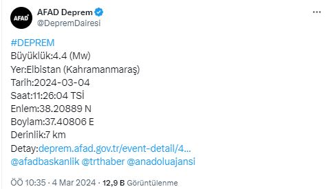 Afet ve Acil Durum Yönetimi Başkanlığı, Kahramanmaraş'ta yeni bir depremi duyurdu.