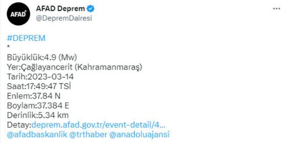 AFAD'dan edinilen bilgiye göre, Kahramanmaraş'ta saat 17.49'ta yerin 5.34 kilometre derinliğinde 4.9 büyüklüğünde bir deprem yaşandı.