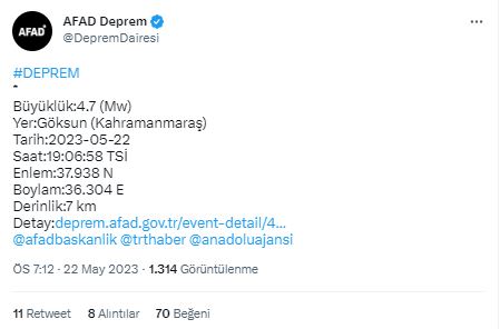 AFAD'ın yaptığı açıklamaya göre Kahramanmaraş'ın Göksun ilçesinde saat: 19:06'da 4.7 büyüklüğünde bir deprem meydana geldi. (HABER MERKEZİ)