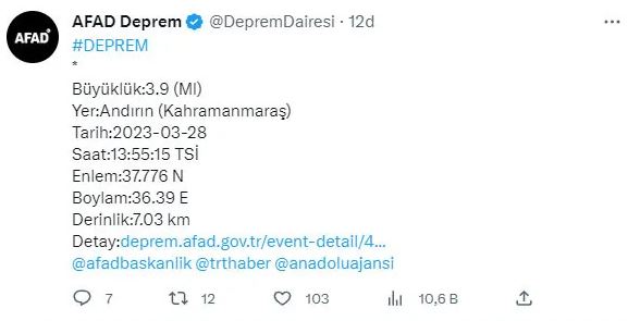 AFAD'dan yapılan açıklamaya göre Kahramanmaraş'ın Andırın ilçesinde 3.9 büyüklüğünde bir deprem meydana geldi.