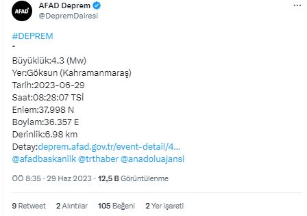 AFAD'dan yapılan açıklamaya göre az önce Kahramanmaraş'ta deprem oldu.