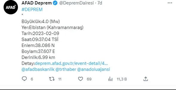 AFAD'dan yapılan açıklamada depremin derinliğinin 6.99 kilometre olduğu bildirildi.