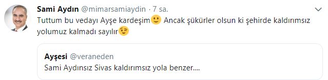 Ayşesi profilinden atılan mesajda, "Sami Aydınsız Sivas kaldırımsız yola benzer...." denirken Aydın bu mesaja "Tuttum bu vedayı Ayşe kardeşim :) Ancak şükürler olsun ki şehirde kaldırımsız yolumuz kalmadı sayılır" mesajıyla karşılık verdi.