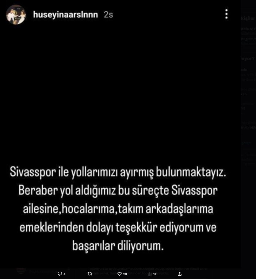Paylaşımında, Sivasspor’da geçirdiği süre boyunca edindiği tecrübeler ve yaşadığı anılar için teşekkür eden Arslan, ayrılık kararını kamuoyuyla paylaştı.