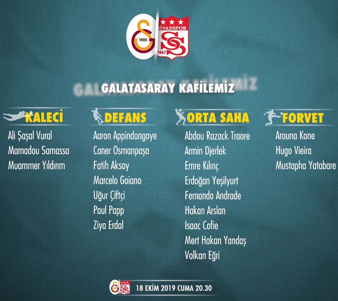 Sakatlıkları devam eden Serhiy Rybalka, Barış Yardımcı ve Furkan Sağman kafilede yer almadı.