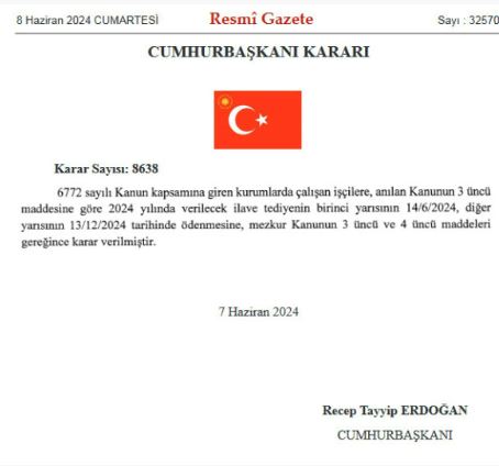 Karara göre işçilere 2024 yılında verilecek olan ilave tediyenin birinci yarısı 14 Haziran tarihinde ödenecek.