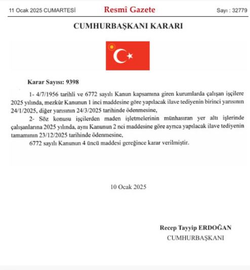 Cumhurbaşkanlığı kararına göre; 6772 sayılı kanun kapsamına giren kurumlarda çalışan işçilere yapılacak ilave tediyenin birinci yarısı 24 Ocak 2025'te yapılacak.