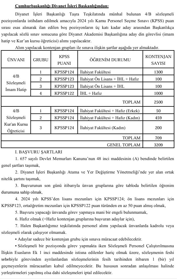 Kontenjan dağılımında 2 bin 500 imam hatip, 709 Kur’an kursu öğreticisi alımı planlanırken, farklı öğrenim durumlarına göre başvuru şartları da ayrı ayrı belirlendi. Adayların ilgili KPSS puan türlerinden en az 50 puan almış olmaları gerekiyor.