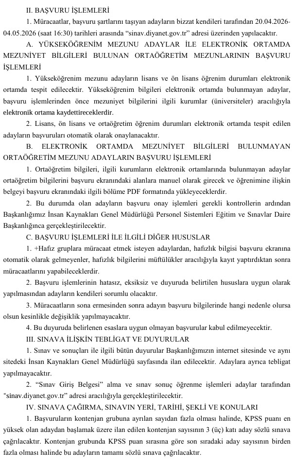 Başvurular, 20 Nisan 2026 ile 4 Mayıs 2026 tarihleri arasında “sinav.diyanet.gov.tr” adresi üzerinden yapılacak. Başvuru sürecinin ardından adaylar, KPSS puan sıralamasına göre sözlü sınava çağrılacak.