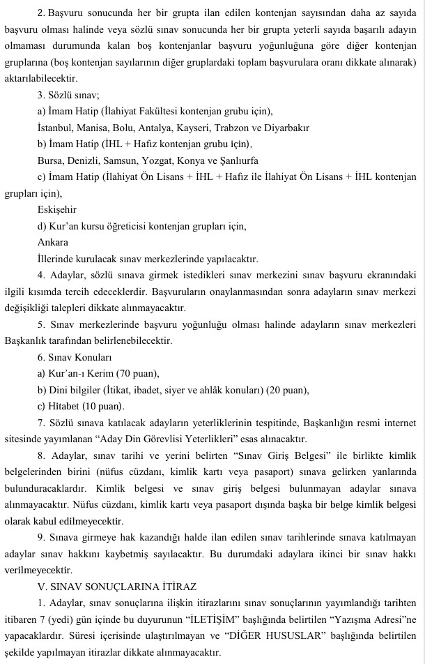 Sözlü sınavlarda adayların Kur’an-ı Kerim bilgisi, dini bilgiler ve hitabet yetenekleri değerlendirilecek. Sınavda başarılı sayılabilmek için en az 70 puan alınması şartı aranacak.