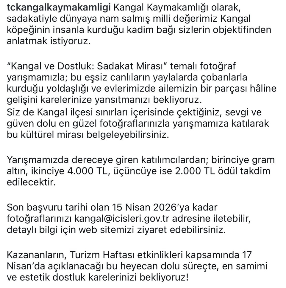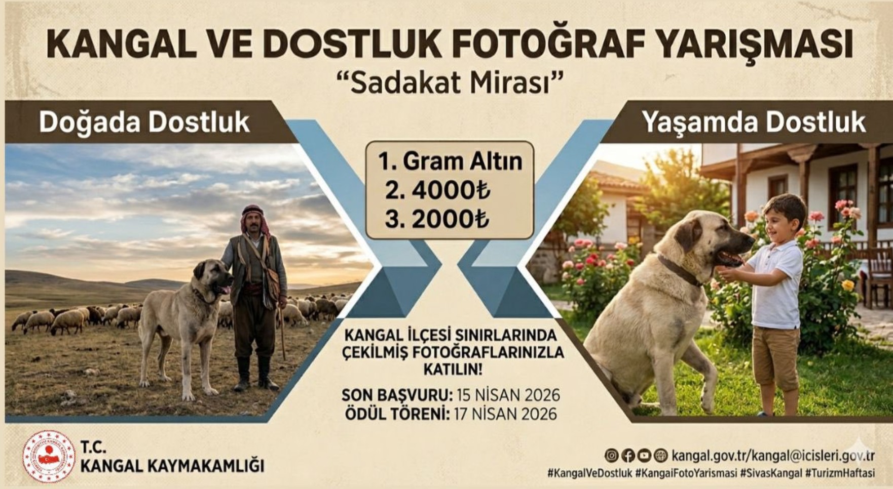 Kangal Kaymakamlığı tarafından düzenlenen yarışma ile Kangal köpeğinin doğada çobanlarla kurduğu bağ ve günlük yaşamda insanlarla olan dostluğu fotoğraf kareleriyle anlatılacak. Yarışmaya katılmak isteyenler, Kangal ilçe sınırları içerisinde çektikleri fotoğraflarla başvuru yapabilecek.