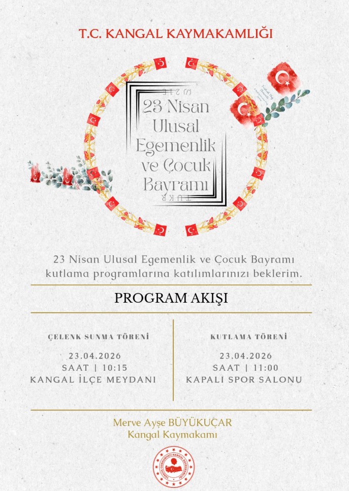 Yapılan duyuruya göre program, 23 Nisan 2026 Perşembe günü saat 10.15’te Kangal İlçe Meydanı’nda gerçekleştirilecek çelenk sunma töreni ile başlayacak. Ardından kutlama programı saat 11.00’de Kapalı Spor Salonu’nda devam edecek.