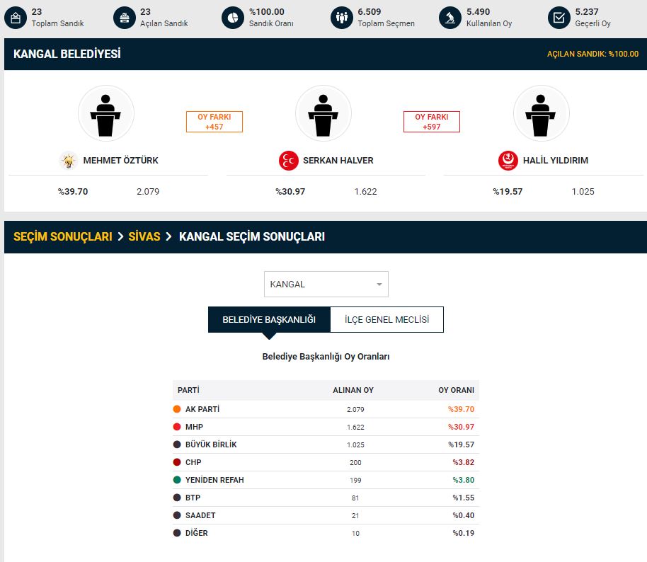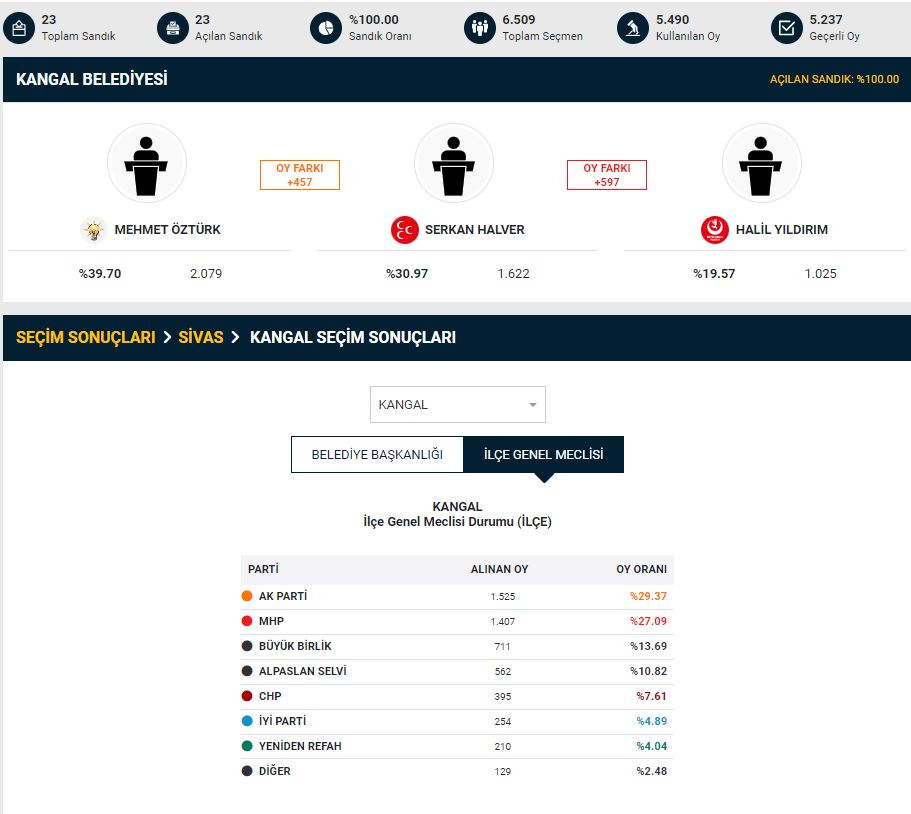 İşte 31 Mart 2024 Yerel Seçimlerinde Kangal İlçesinin Başkanlık seçim sonuçları..