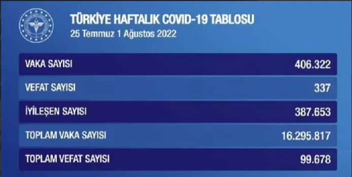 Sağlık Bakanlığının haftalık Kovid-19 verilerine göre, 25 Temmuz-1 Ağustos'ta 406 bin 322 kişinin testi pozitif çıktı, 337 kişi hayatını kaybetti.