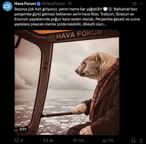 Meteoroloji kaynağı Hava Forum, sosyal medya hesabından yaptığı açıklamada, “Sezona çok hızlı giriyoruz, yarım metre kar yağabilir! Balkanlar’dan perşembe günü gelmesi beklenen serin hava Rize, Trabzon, Giresun ve Erzurum yaylalarında yoğun kara neden olacak. Perşembe gecesi ve cuma yaylalara çıkacak olanlar yolda kalabilir, dikkatli olun…” ifadelerine yer verdi.