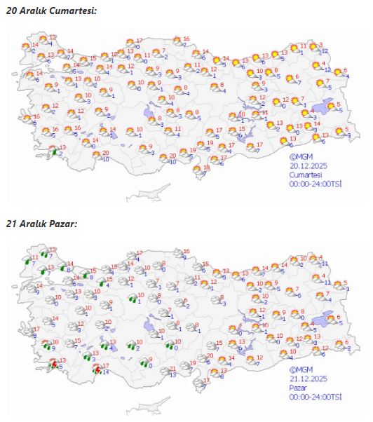 Bugün itibarıyla Türkiye’nin büyük bölümünde güneşli ve az bulutlu bir hava hakim. Yağış beklenmezken, kuzeybatı kesimlerde hafif rüzgarların etkili olacağı tahmin ediliyor. Bölgelere göre sıcaklıkların Marmara’da 12-20, Ege’de 14-20, Akdeniz’de 15-21, İç Anadolu’da 10-17, Karadeniz’de 12-18, Doğu Anadolu’da 5-12 ve Güneydoğu Anadolu’da 10-18 derece arasında seyretmesi bekleniyor.