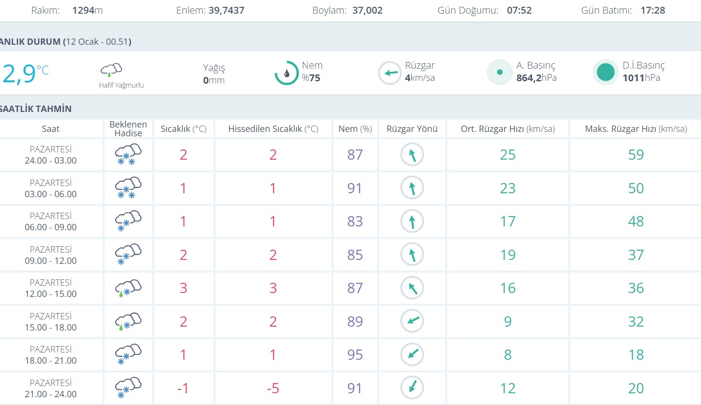 Saatlik tahminlere göre Pazartesi günü gece yarısından itibaren kar yağışı etkisini göstermeye başlayacak. 00.00–03.00 saatleri arasında sıcaklık 2 derece civarında seyrederken, rüzgârın saatte 25 kilometre hıza, hamlelerin ise 59 kilometreye kadar çıkması bekleniyor. Sabah saatlerine doğru sıcaklık 1 dereceye düşerken, nem oranının yüzde 90’ın üzerine çıkmasıyla birlikte buzlanma riskinin artacağı öngörülüyor.