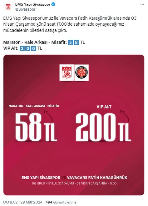 "EMS Yapı Sivasspor'umuz ile Vavacars Fatih Karagümrük arasında 03 Nisan Çarşamba günü saat 17.00'de sahamızda oynayacağımız mücadelenin biletleri satışa çıktı.