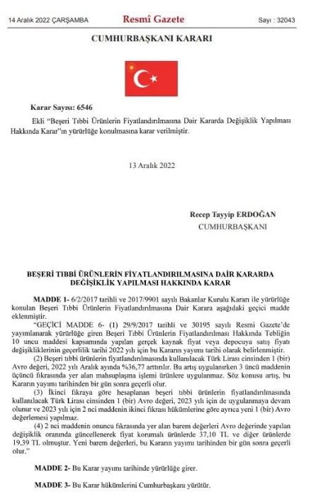 Beşeri Tıbbi Ürünlerin Fiyatlandırılmasına Dair Kararda Değişiklik Yapılması Hakkında Cumhurbaşkanı Kararı Resmi Gazete'nin bugünkü sayısında yayımlandı. Buna göre, beşeri tıbbi ürünlerin fiyatlandırılmasında kullanılacak Türk Lirası cinsinden 1 avro değeri yüzde 36,77 oranında arttırıldı.