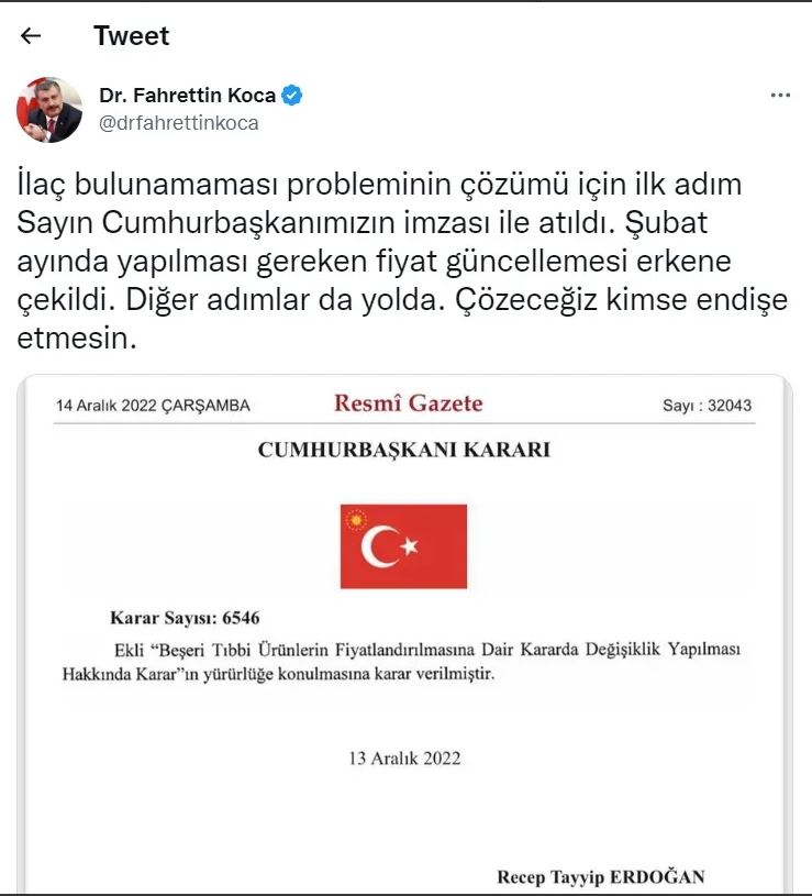 Sağlık Bakanı Fahrettin Koca da sosyal medya hesabından kararla ilgili paylaşım yaptı. Bakan Koca, "İlaç bulunamaması probleminin çözümü için ilk adım Sayın Cumhurbaşkanımızın imzası ile atıldı. Şubat ayında yapılması gereken fiyat güncellemesi erkene çekildi. Diğer adımlar da yolda. Çözeceğiz kimse endişe etmesin." ifadelerini kullandı.