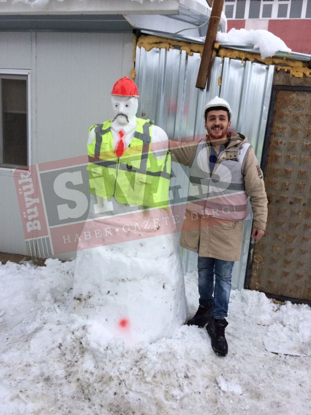 Sivas Mevlana Tüneli Projesinde yaz kış demeden yoğun bir mesai ile çalışan işçiler, mola verdikleri sırada kardan adam yaparak üstüne fosforlu yelek giydirip, kask taktılar.