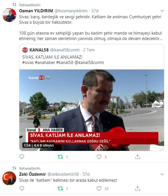 Zeki Özdemir attığı tweette "Sivas ile “katliam” kelimesi bir arada kabul edilemez!" derken, Osman Yıldırım ise "Sivas; barış, kardeşlik ve sevgi şehridir. Katliam ile anılması Cumhuriyet şehri Sivas’a büyük bir haksızlıktır. 108 gün atasına ev sahipliği yapan bu kadim şehir manda ve himayeyi kabul etmemiş; her zaman devletinin yanında olmuş, olmaya da devam edecektir…" dedi.