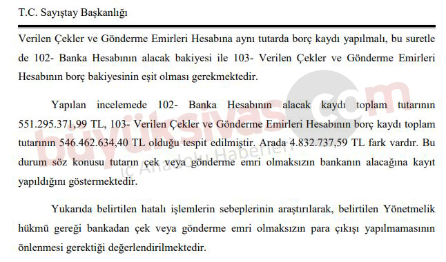 Sayıştay tarafından yapılan incelemede "Banka Hesabının alacak kaydı toplam tutarının 551.295.371,99 TL" ve "Verilen Çekler ve Gönderme Emirleri Hesabının borç kaydı toplam tutarının 546.462.634,40 TL" olduğu tespit edildi.