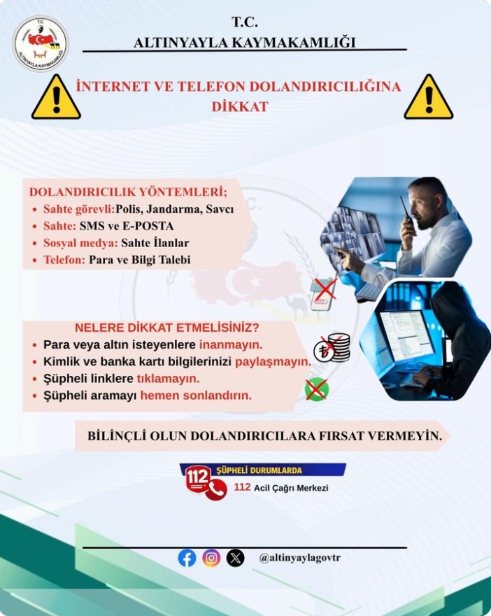 Altınyayla, Altınyayla Kaymakamlığı, Dolandırıcılık Uyarısı, İnternet Dolandırıcılığı, Telefon Dolandırıcılığı, Sahte Arama, Sahte SMS, Vatandaş Uyarısı