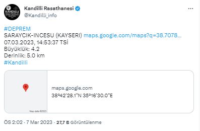 AFAD ise Kayseri İncesu'da gerçekleşen ikinci depremin büyüklüğünü ise 4.3 olarak açıkladı.