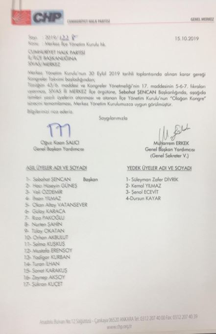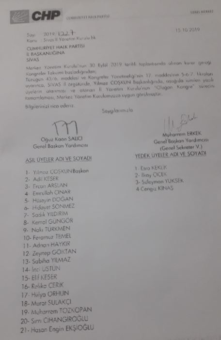 CHP Genel Merkezi tarafından resmi yazı ile İl ve İlçe yönetime durum tebliğ edilirken yeni İl ve İlçe yöneticileri  de yazıda belirtildi. Gönderilen yazıda Merkez Yönetim Kurulu'nun 30 Eylül 2019 tarihli toplantısında alınan karar gereği Kongreler takvimi başladığından tüzüğün 43/6 maddesi ve Kongreler Yönetmeliğinin 17. maddesinin 5-6-7 fıkraları uyarınca, Sivas il örgütünde Yılmaz Coşkun başkanlığında aşağıda isimleri yazılı üyelerin atanması ve atanan İl Yönetim Kurulu'nun Olağan Kongre sürecini tamamlaması Merkez Yönetim Kurulumuzca uygun görülmüştür