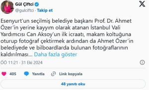 CHP Genel Başkan Yardımcısı Gül Çiftci, sosyal medya üzerinden yaptığı paylaşımda, "Esenyurt'un seçilmiş belediye başkanı Prof. Dr. Ahmet Özer’in yerine kayyım olarak atanan İstanbul Vali Yardımcısı Can Aksoy'un ilk icraatı, makam koltuğuna oturup fotoğraf çektirmek ve ardından Ahmet Özer’in belediyedeki ve bilboardlardaki fotoğraflarının kaldırılması talimatını vermek oldu" ifadelerini kullandı.