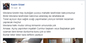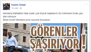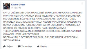 Mevlana Mahallesi Muhtarı Kazım Gözel Sivas Belediyesini hedef aldı. Bir zamanlar sıkça kameralara Sivas Belediye Başkanı Sami Aydın ile birlikte görüntü veren Gözel sosyal medya paylaşım sitesi Facebook üzerinden Sivas Belediyesine verdi veriştirdi.