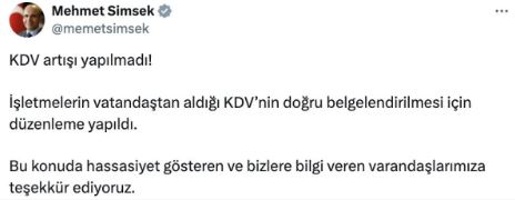 Hazine ve Maliye Bakanı Mehmet Şimşek, bir mesaj paylaşarak, işletmelerin vatandaştan aldığı KDV’nin doğru belgelendirilmesi için düzenleme yapıldığını bildirdi.