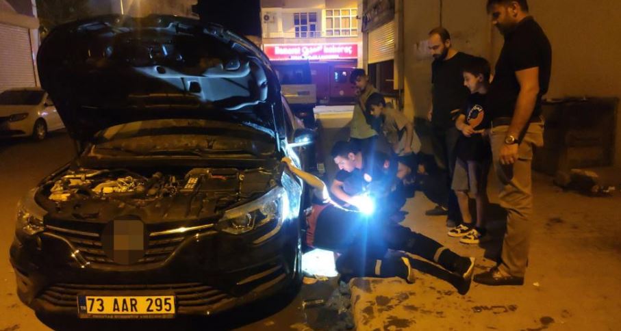 Şırnak'ın Cizre ilçesinde araç içine sıkışan yavru kediyi kurtarmak için ilginç bir yol denendi. Yavru kedi aracın kaputundan çıkmayınca çevredeki vatandaşlar cep telefonundan açtıkları kedi sesi ile çıkarmaya çalıştı.
