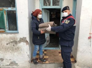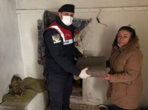 Sivas’ta Jandarma ekipleri 150 sokak kedisine annelik yapan Hatice Alkan’a mama ve battaniye desteğinde bulundu.