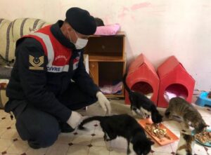 Jandarma ekipleri kedilerin ihtiyaçlarının karşılanması ve destek olunması noktasında Alkan’a battaniye ve mama yardımında bulundu.iha