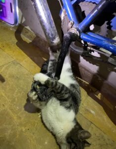 Olay, Esentepe Mahallesi'nde bulunan bir sitede meydana geldi. Sitenin bahçesinde park halinde olan bisikletin zincirine, kedinin arka ayağı sıkıştı. Kedinin çırpındığını gören vatandaşlar durumu İnegöl İtfaiyesine bildirdi. Olay yerine gelen itfaiye ekipleri, zinciri demir markasıyla kesip kediyi kurtardı. Kurtarma anı kameraya saniye saniye yansıdı. iha