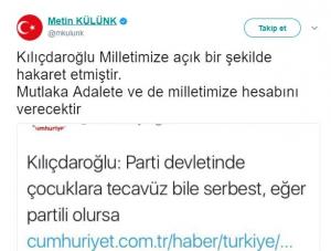 Kılıçdaroğlu'nun skandal ifadelerine AK Parti'den ilk tepki Metin Külünk'ten geldi. Külünk twitter hesabından yaptığı paylaşımda "Kılıçdaroğlu Milletimize açık bir şekilde hakaret etmiştir. Mutlaka Adalete ve de milletimize hesabını verecektir" dedi.