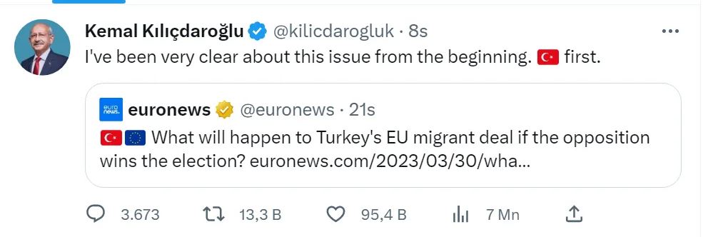 Euronews’in “What will happen to Turkey's EU migrant deal if the opposition wins the election? (Muhalefet seçimi kazanırsa Türkiye'nin AB Göçmen Anlaşması'na ne olacak?)” başlıklı makalesini alıntılayan Kılıçdaroğlu’nun Twitter hesabından bu akşam yaptığı açıklama şöyle: “I've been very clear about this issue from the beginning. Türkiye first. Başından beri bu konu hakkında çok nettim. Önce Türkiye.”