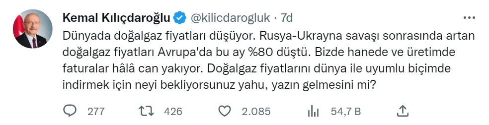 Kemal kılıçdaroğlu kişisel Twitter hesabı üzerinden şu paylaşımı yaptı: "Dünyada doğalgaz fiyatları düşüyor. Rusya-Ukrayna savaşı sonrasında artan doğalgaz fiyatları Avrupa'da bu ay %80 düştü. Bizde hanede ve üretimde faturalar hâlâ can yakıyor. Doğalgaz fiyatlarını dünya ile uyumlu biçimde indirmek için neyi bekliyorsunuz yahu, yazın gelmesini mi?"