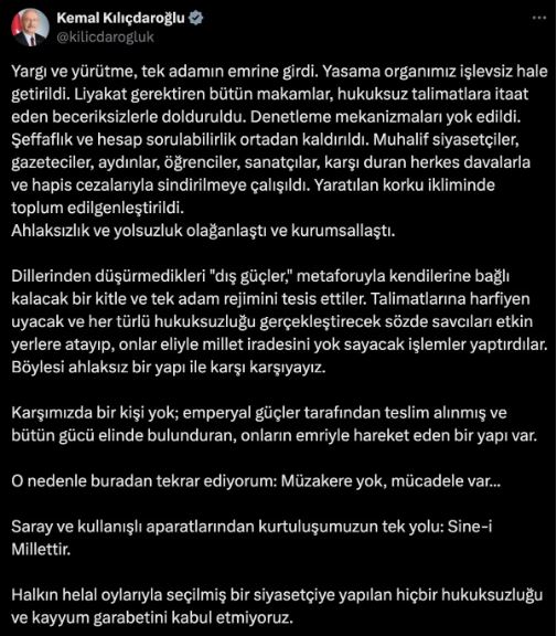 Esenyurt Belediyesi'ne kayyum atanmasına karşı sessizliğini bozan CHP'nin eski lideri Kemal Kılıçdaroğlu, tek kurtuluş yolunun sine-i millet olduğunu söyledi.