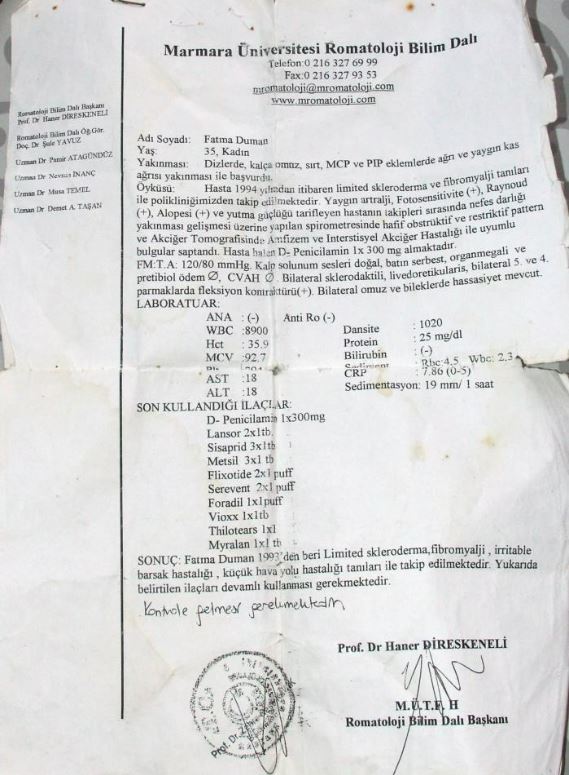 Giresun'un Bulancak ilçesinde yaşayan 55 yaşındaki Fatma Duman, 35 yıl önce nadir hastalıklardan biri olan 'Skleroderma' hastalığına yakalandı. Gittiği bir çok hastanede tedavisinin mümkün olmadığını ileri sürerek 5-6 ay ömür biçen doktorları hayatını kaybetti ama Fatma Duman 35 yıldır yaşamını sürdürüyor.