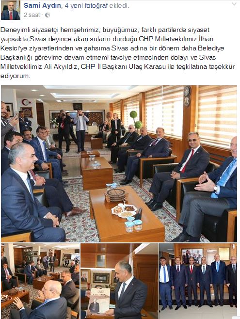 Sivas için bir dönem daha Belediye Başkanlığına mutlaka aday olmalısınız dediği Sami Aydın, bu temennileri sosyal medya hesabından “Deneyimli siyasetçi hemşehrimiz, büyüğümüz, farklı partilerde siyaset yapsakta Sivas deyince akan suların durduğu CHP Milletvekilimiz İlhan Kesici'ye ziyaretlerinden ve şahsıma Sivas adına bir dönem daha Belediye Başkanlığı görevime devam etmemi tavsiye etmesinden dolayı ve Sivas Milletvekilimiz Ali Akyıldız, CHP İl Başkanı Ulaş Karasu ile teşkilatına teşekkür ediyorum” mesajıyla duyurdu.