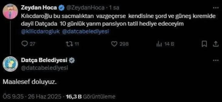 Geçtiğimiz günlerde bir sosyal medya kullanıcısı, “Kılıçdaroğlu partinin başına dönmezse Datça'da tatile gönderilsin” şeklinde esprili bir paylaşım yaptı. Datça Belediyesi resmi hesabı ise bu paylaşıma “Maalesef doluyuz.” yanıtını vererek sosyal medyada dikkat çekti.