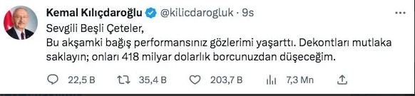 CHP Genel Başkanı Kemal Kılıçdaroğlu, Türkiye Tek Yürek adlı kampanyaya yüklü bağışlarla destek veren '5'li Çete' diye adlandırdığı şirketlere Twitter'dan seslenerek, "Bu akşamki bağış performansınız gözlerimi yaşarttı, dekontları mutlaka saklayın" dedi.
