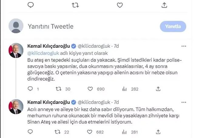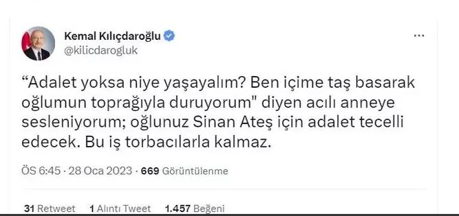 Eski Ülkü Ocakları Başkanı Sinan Ateş'in Ankara'da öldürülmesi sonrasında siyaset gündeminde tartışmalar devam ediyor. CHP Genel Başkanı Kemal Kılıçdaroğlu sosyal medya hesabından yaptığı açıklamada, "Bu iş torbacılarla kalmaz. Bu ateş en tepedeki suçluları da yakacak. Şimdi istedikleri kadar polise-savcıya baskı yapsınlar, dua okunmasını yasaklasınlar, 4 ay sonra görüşeceğiz." dedi.